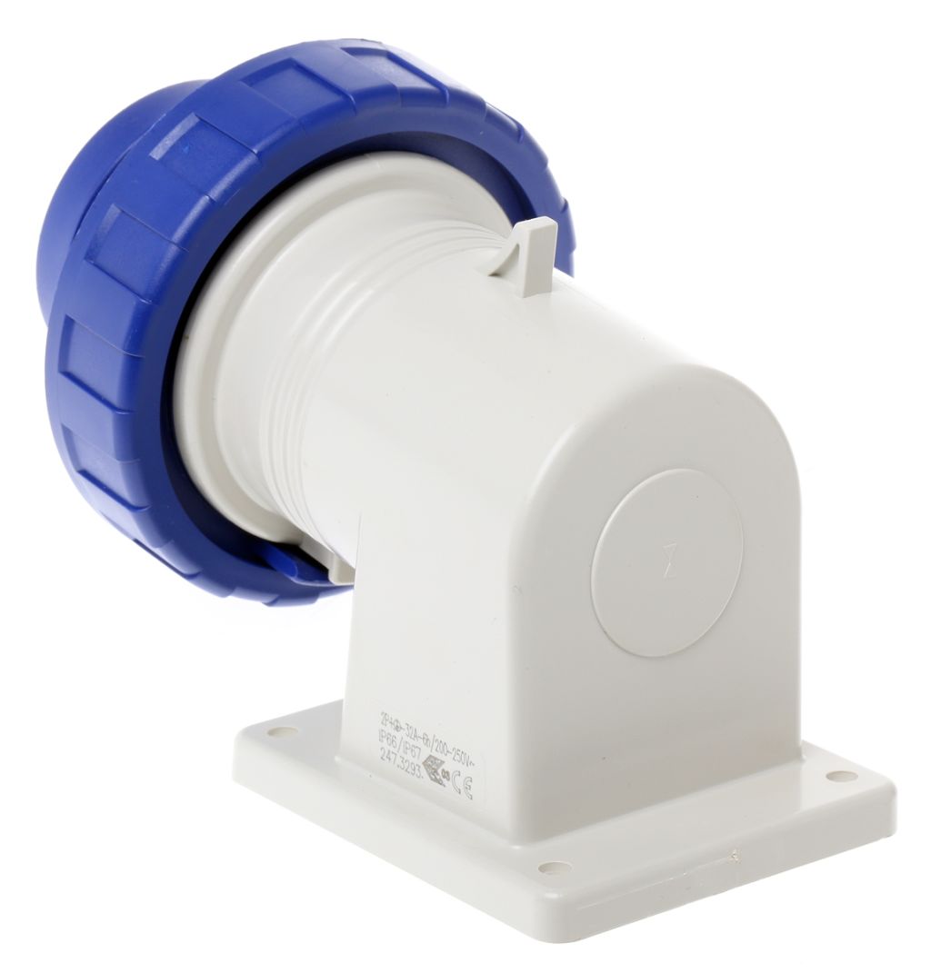 | Product description | RS PRO IP66, IP67 Blue Wall Mount 2P+E Right Angle Industrial Power Plug, Rated At 32A, 230.0 V |