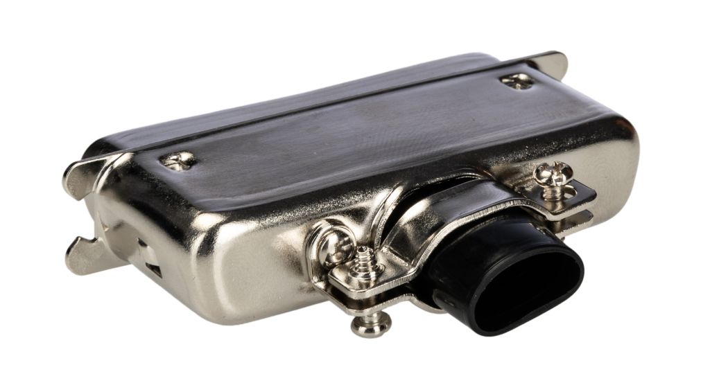 Plugs with tin-plated solder bucket terminations, supplied with a shielded metal cover and rubber cable gland.