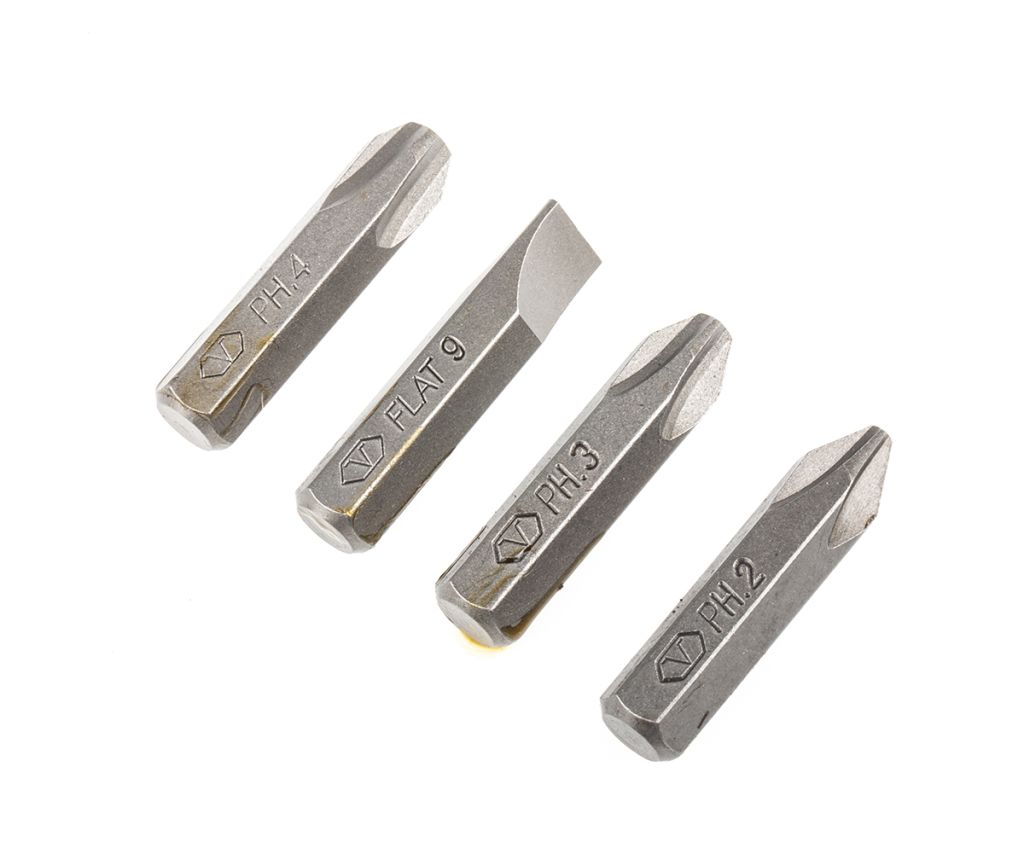 The bit driver handle is made from chrome vanadium steel for assured reliable tool life. The bits themselves are made from chrome molybdenum steel and heat treated for extra hardness.