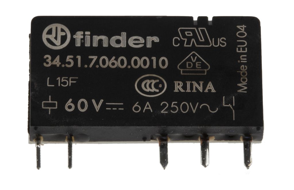 | Product description | Finder, 60V dc Coil Non-Latching Relay SPDT, 6A Switching Current PCB Mount Single Pole, 34.51.7.060.0010 |