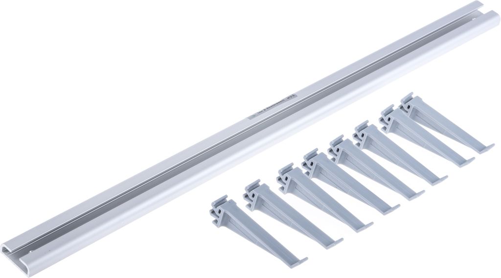 Hirshcmann Test and Measurement labrotory test lead holder with plastic brackets, containing one aluminium rail and 30 plastic lead brackets and a fastening kit.