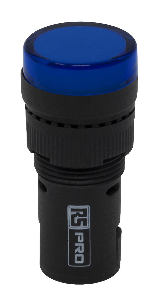 Product description RS PRO, Panel Mount Blue LED Pilot Light, 16mm Cutout, IP40, Round, 230 V ac