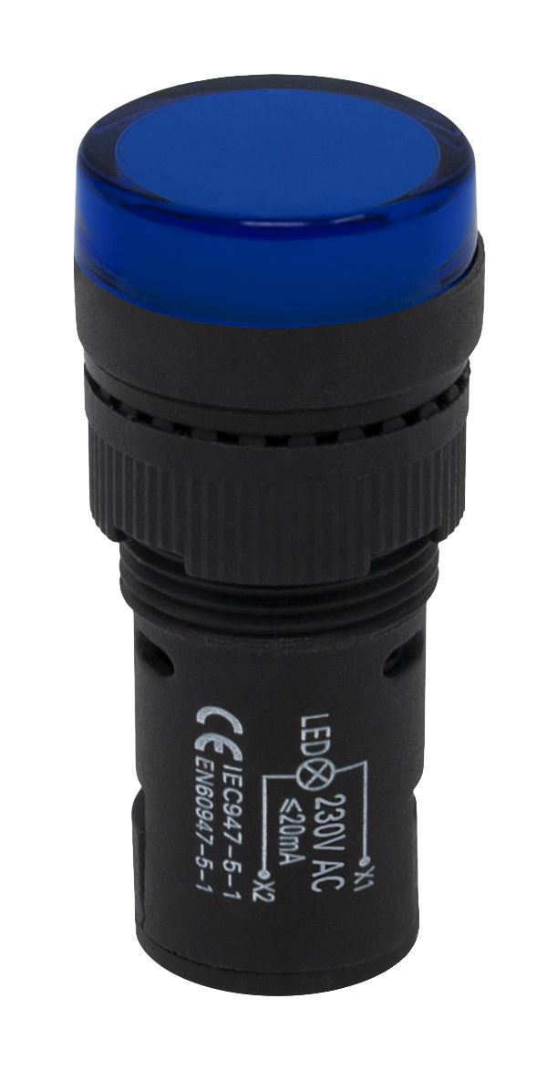 | Product description | RS PRO, Panel Mount Blue LED Pilot Light, 16mm Cutout, IP40, Round, 230 V ac |