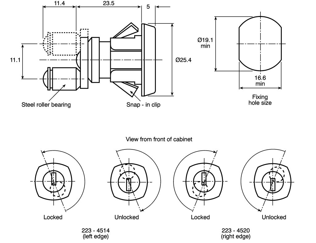 By turning the key 180°, the roller cam on the back of the lock moves the cabinet locking bar downwards