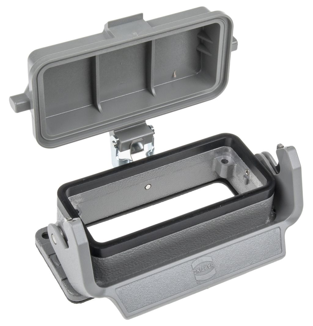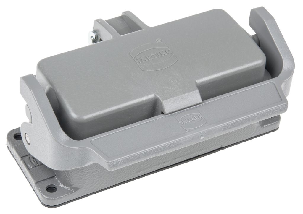 Harting Han 16B hoods and housings offered in a wide selection of formats, single lever, double lever, high and low construction, suitable for many applications. Utilises Han inserts, modules and frames.