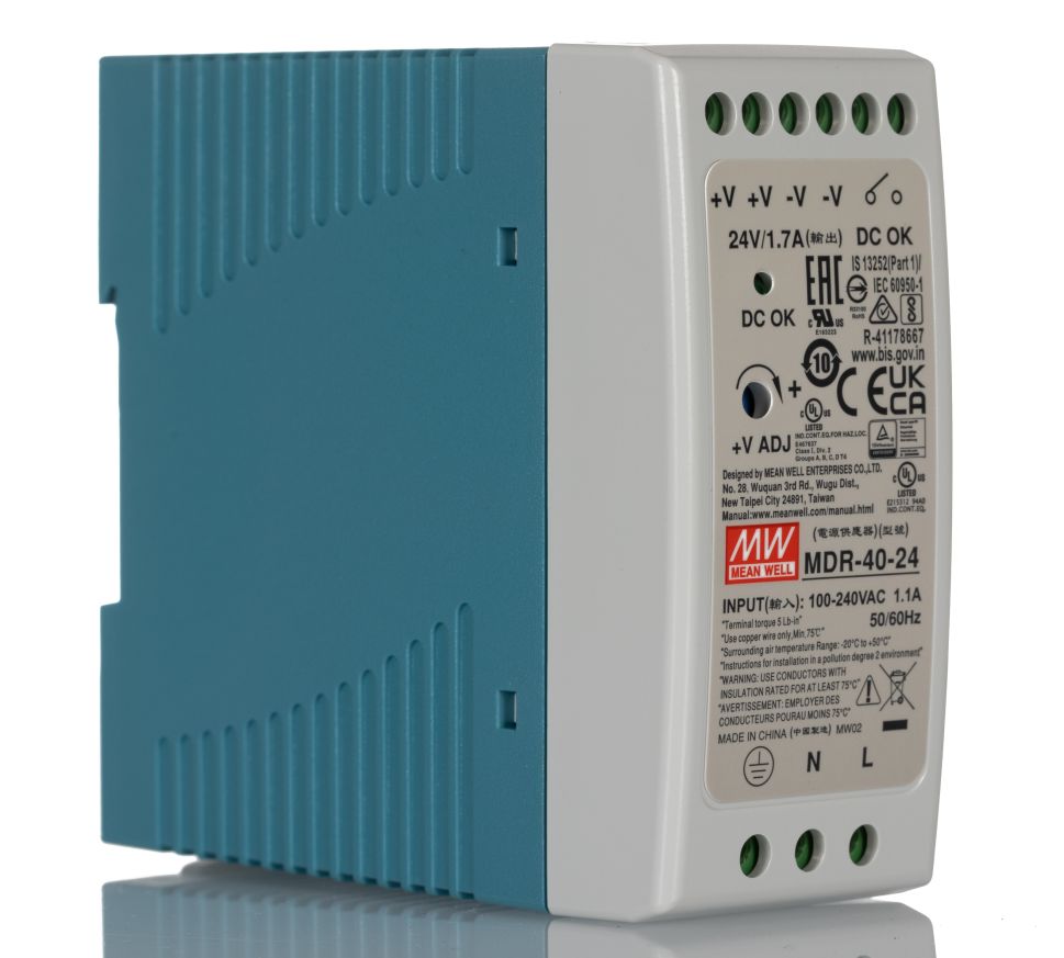 | Product description | Mean Well MDR Switch Mode DIN Rail Power Supply 85 → 264V ac Input, 24V dc Output, 1.7A 40W |