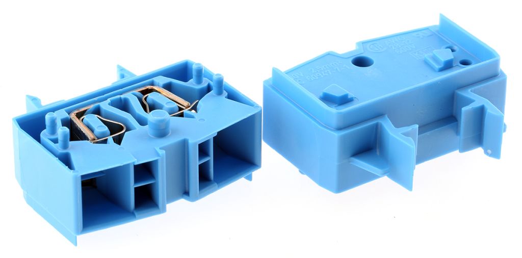 Front-entry miniature screwless DIN Rail terminals are designed for snap-mounting onto symmetrical DIN Rail 467-349. The terminals have a clamp design that ensures the clamping force automatically adjusts to the size of the connector. Thus resulting in a corrosion-free contact area, and compensates for any deformation of the conductor due to cold flow or settling of strands.
