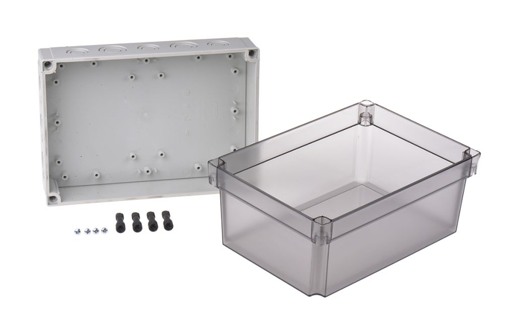 This enclosure comes complete with TPE gasket, screws for mounting plate/DIN rail and cover screws for lid.