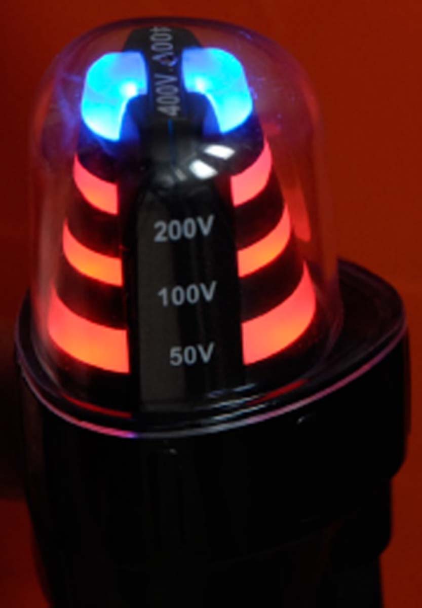 The MTL20B incorporates two test buttons, one on the body of the unit and one on the probe. Simultaneous depression of both buttons enables the unit to draw a high current, allowing the user to differentiate between phantom voltages and hazardous persistent voltages. The MTL20B has a blue LED light that comes on when detecting voltages over 310 volts.