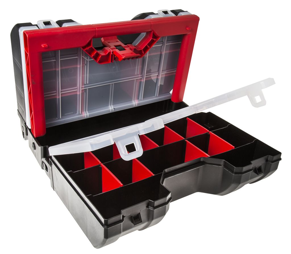 The plastic organiser toolbox from Facom provides storage for parts, hand tools and power tools. Within the toolbox there are 9 removable partitions that can accommodate smaller parts like nuts and screws, a central compartment for screwdrivers or hammers, and 6 larger removable partitions for power tools.