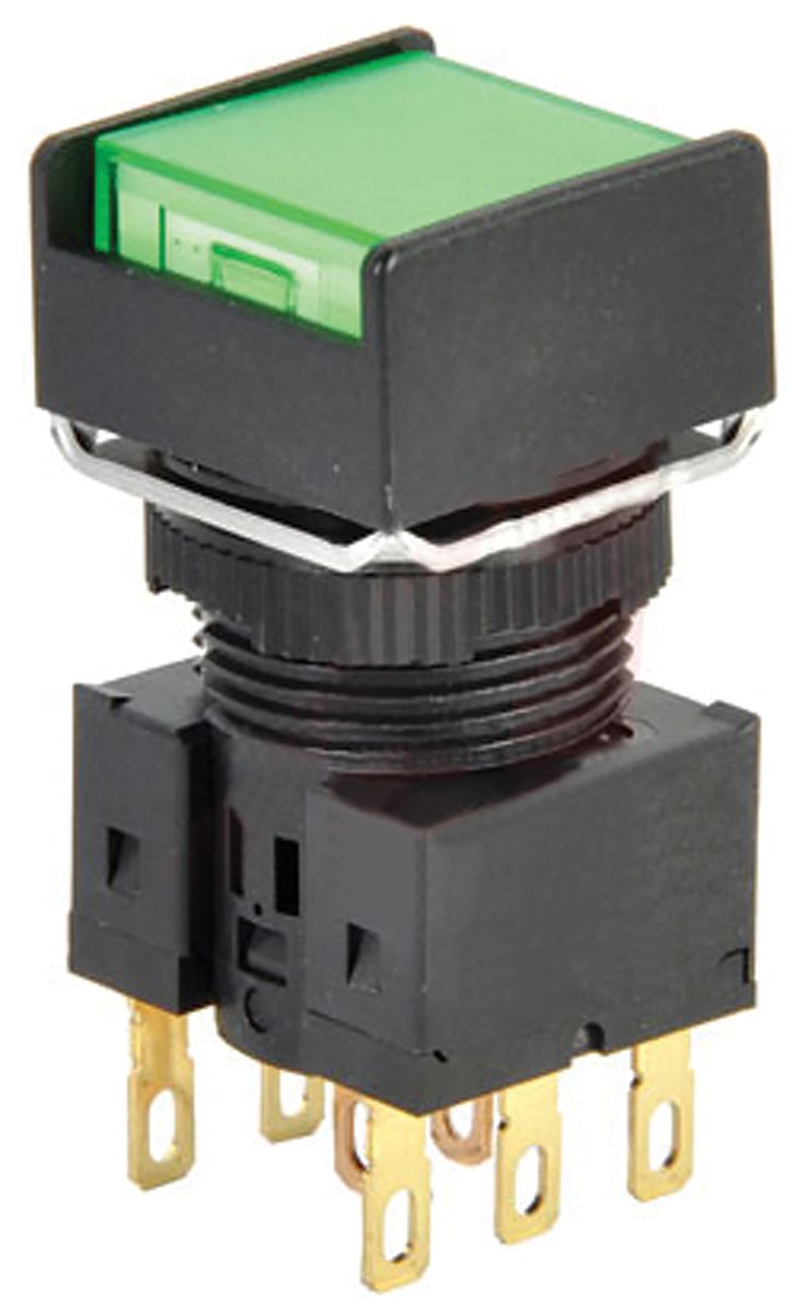 | Product description | Omron, A16 Illuminated Green Square Push Button, DPDT-NO/NC, 16mm Momentary PCB Pin |