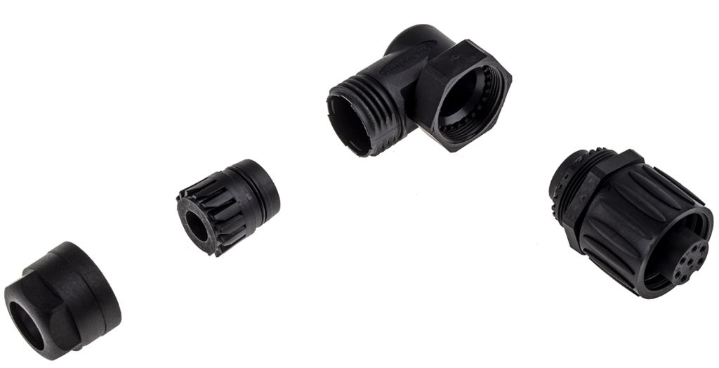 From Amphenol, these right angle Eco Mate series circular connectors have a compact and robust design, with a screw lock connection that meets the high requirements of industrial technology applications. The 90° Eco Mate circular connectors are easy to assemble and are supplied with fittings which include strain relief, mounted gaskets, cable glands and clamping rings. The screwed cable gland has a robust thread for a secure connection.