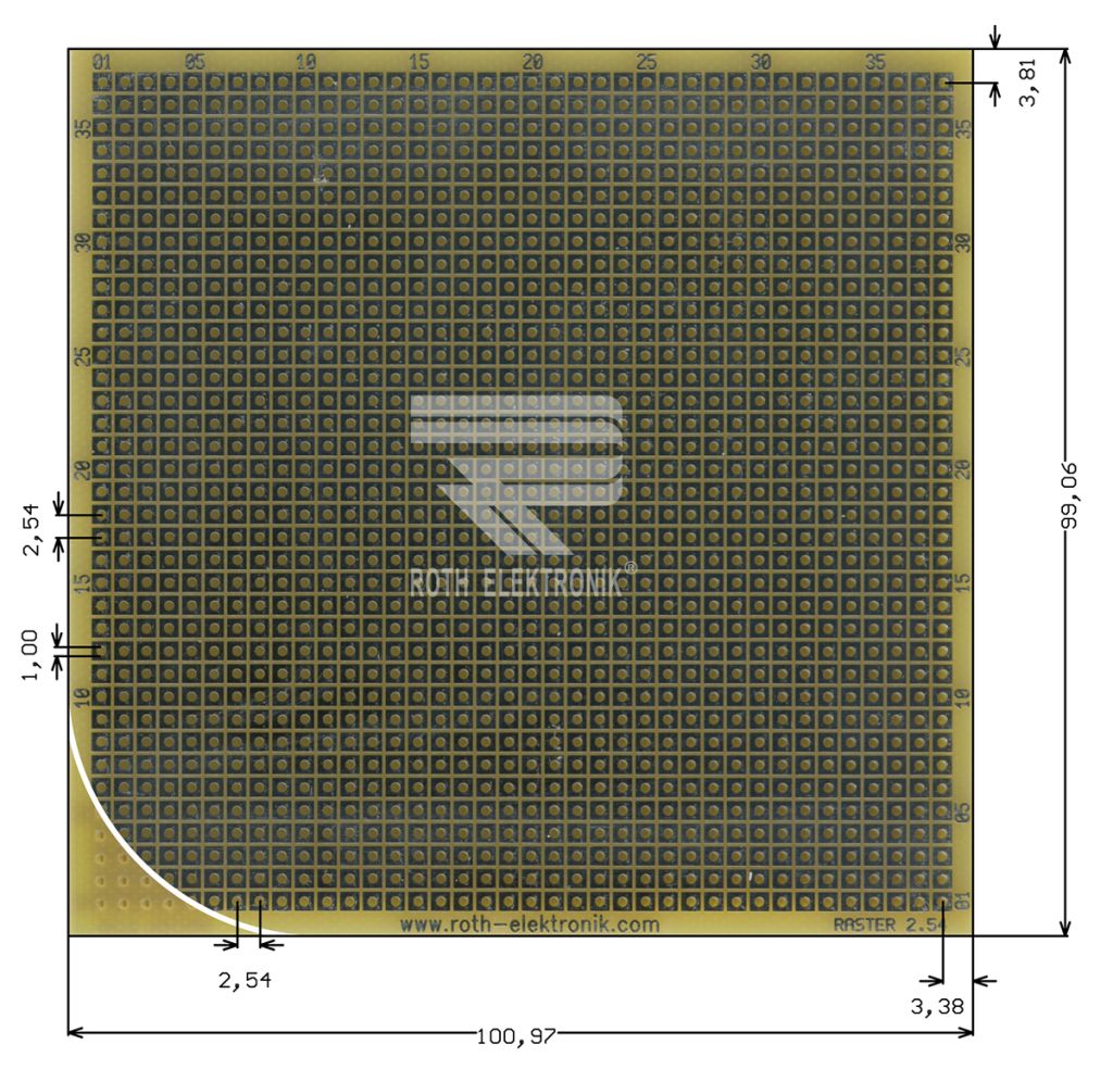 | Product description | Roth Elektronik Single Sided Matrix Board FR4 With 37 x 38 1mm Holes, 2.54 x 2.54mm Pitch, 100.97 x 99.06 x 1.5mm |
