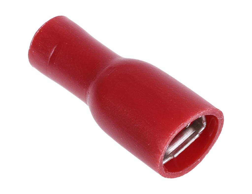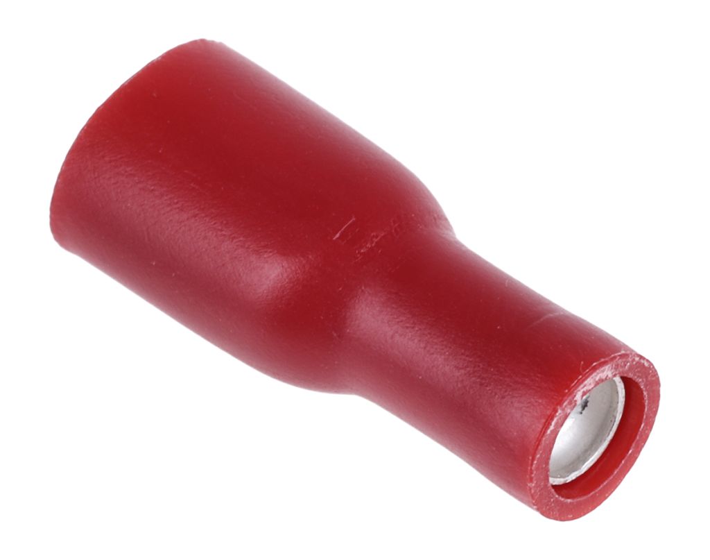 From RS PRO a high-quality fully insulated crimp receptacle terminal sometimes known as a female quick disconnect. Female crimp receptacles are a type of electrical wiring connector which, when mated with a male tab connector (or male quick disconnect), provide a fast and reliable interconnect between two wires. The body of the connector is made from tin plated brass and features an additional internal copper sleeve. This copper sleeve strengthens the barrel and provides a robust and secure crimp. The sleeve also protects the wire against stress and high vibration. The main feature of this female receptacle is the insulation which covers the entire length of the connector body. This insulation provides protection against electric shock and acts as a ’mini’ enclosure to protect the connection from dirt, grease, liquids and other contaminants when mated.
