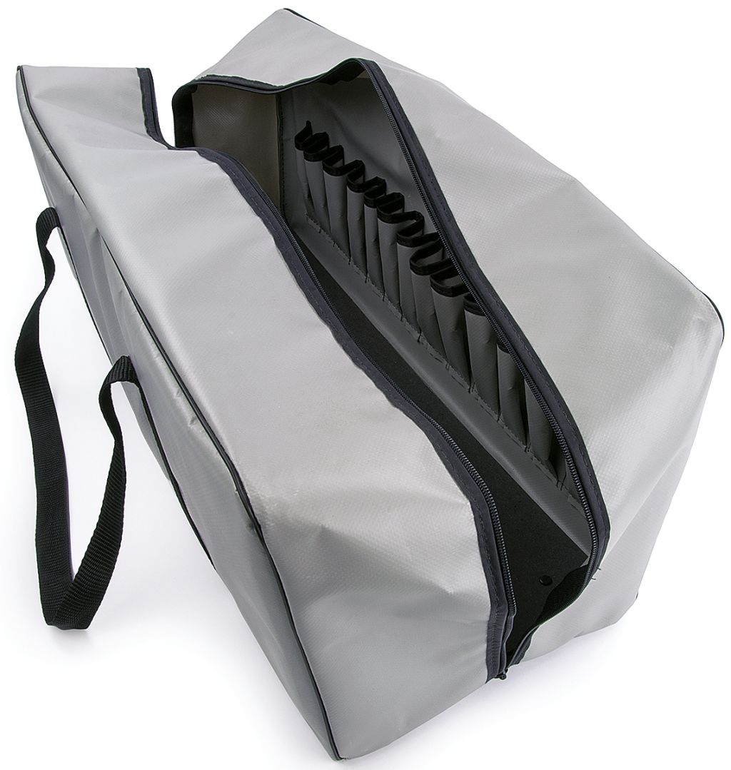 RS PRO zipper tool bag measures 660mm x 250mm x 230mm. This holdall style tool bag is manufactured from a tough, nylon fibre reinforced light grey PVC. This bag has a zip running all the way to the base of the bag which is operable from both ends. One side of the bag has 2 large pockets which will accommodate blocks 290mm x 45mm x 100mm and 275mm x 45mm x 100mm. The other side has 6 pockets to hold handles 40mm diameter and 7 pockets 30mm in diameter. It is convenient for carrying those larger tools that do not fit into a conventional toolbox. The webbing handle runs all the way around the bag and is stitched and riveted for extra strength.