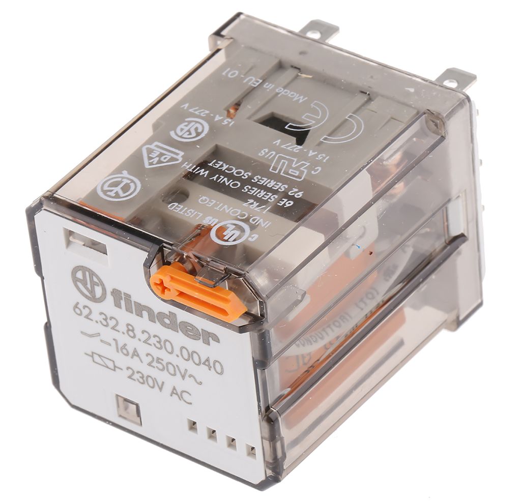 Product description Finder, 230V ac Coil Non-Latching Relay DPDT, 16A Switching Current Plug In, 2 Pole, 62.32.8.230.0040