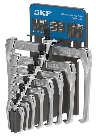 These SKF reversible jaw pullers are suitable for the internal and external pulling of bearings and other components, such as gears and pulleys. The eight pullers are of a standard range so are suitable for a wide range of bearing and component sizes. Unlike many similar pullers, the TMMR F series has a spindle tip cone which rotates helping to reduce shaft damage and enhance stability.