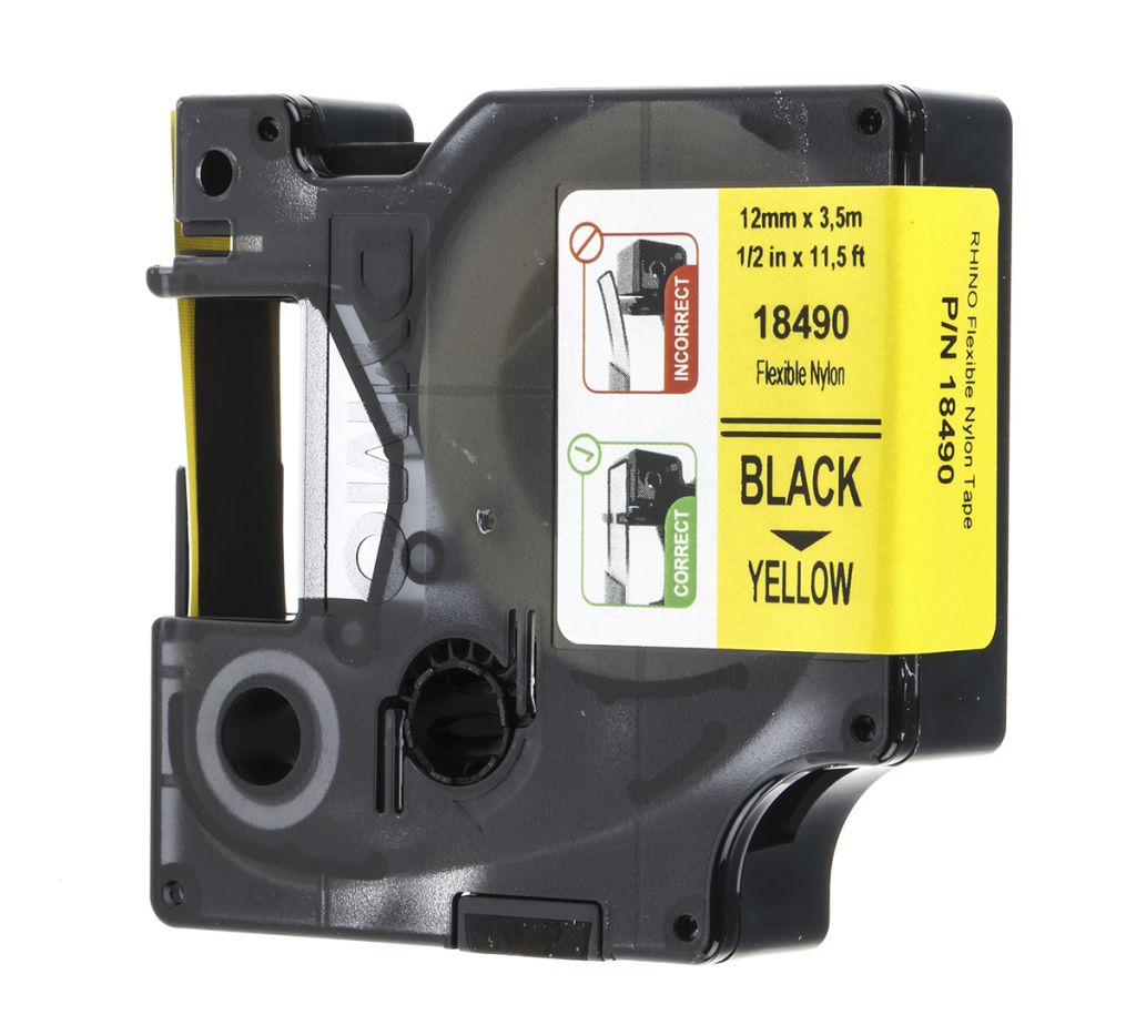Industrial Rhino flexible nylon printer label tapes from DYMO. These easy peal tapes make applying labels quick and easy on any surface are available with black on white print or black on yellow. These labels are industrial strength adhesive and can resist moisture, extreme temperatures and harsh environments meaning the labels will not smudge, smear or fade and can stick to your surface for much longer without curling or falling off. With the size of these label printer tapes, they are designed to stick tightly to wires, cables and curved surfaces. All of these label printer tapes come with a length of 3.5m.