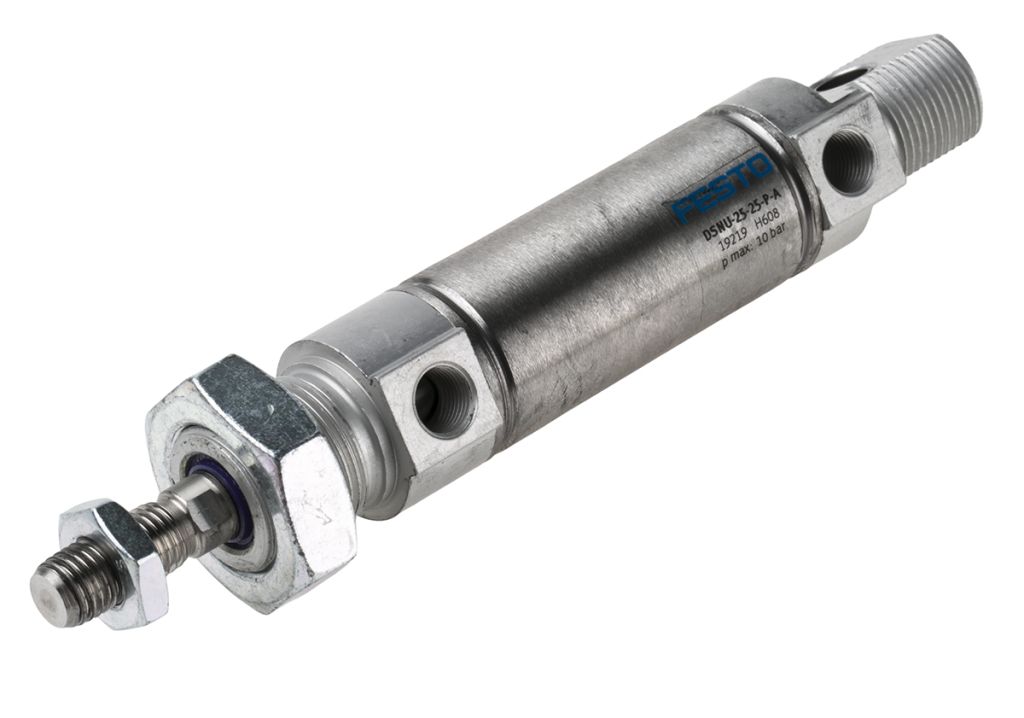 Festo DSNU series round pneumatic cylinders with flexible cushioning rings at both ends of the actuator barrel. Featuring a stainless steel piston rod within a 3 component system that provides excellent running performance and long service life. These double acting pneumatic actuators have dual connection ports for compressed air to be applied for advancing and retracting the piston rod in a linear motion. An extensive range of accessories makes it possible to install the DSNU cylinders virtually anywhere.