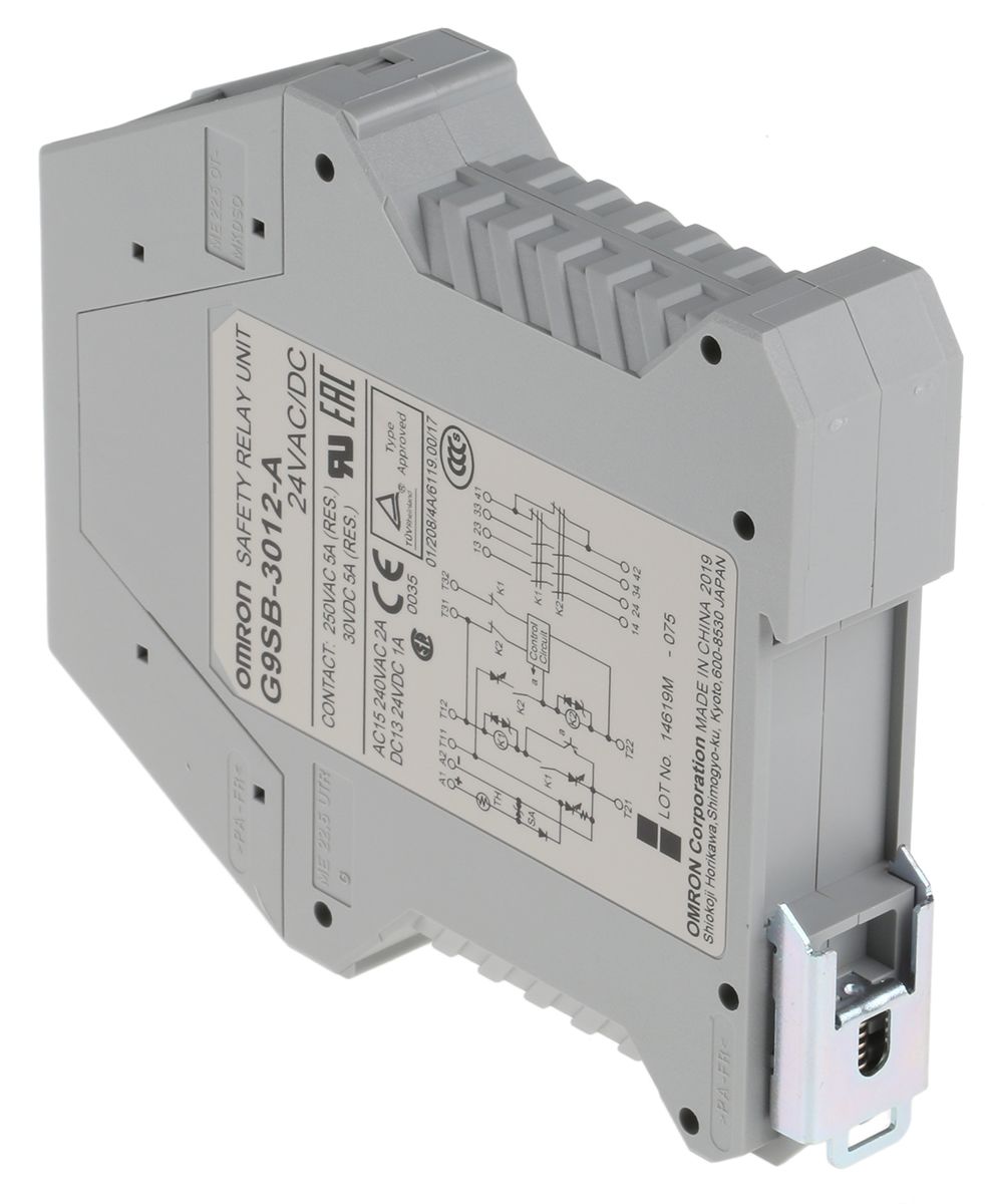 The Omron G9SB series is an ultra slim safety relay available in either a 17.5mm or 22.5mm housing. The 17.5mm units have 2 or 3 safety contacts and the 22.5mm units have 3 safety contacts and an auxiliary contact.