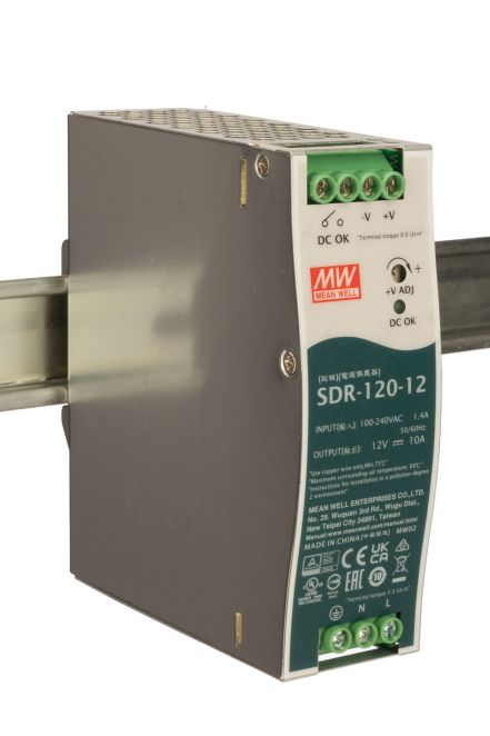 | Product description | Mean Well SDR Switch Mode DIN Rail Power Supply 88 → 264V ac Input, 12V dc Output, 10A 120W |