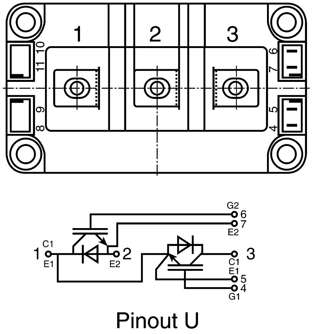 A range of SEMITOP® IGBT modules from Semikron incorporating two series-connected (half bridge) IGBT devices. The modules are available in a wide range of voltage and current ratings and are suitable for a variety of power switching applications such as AC inverter motor drives and Uninterruptible Power Supplies.