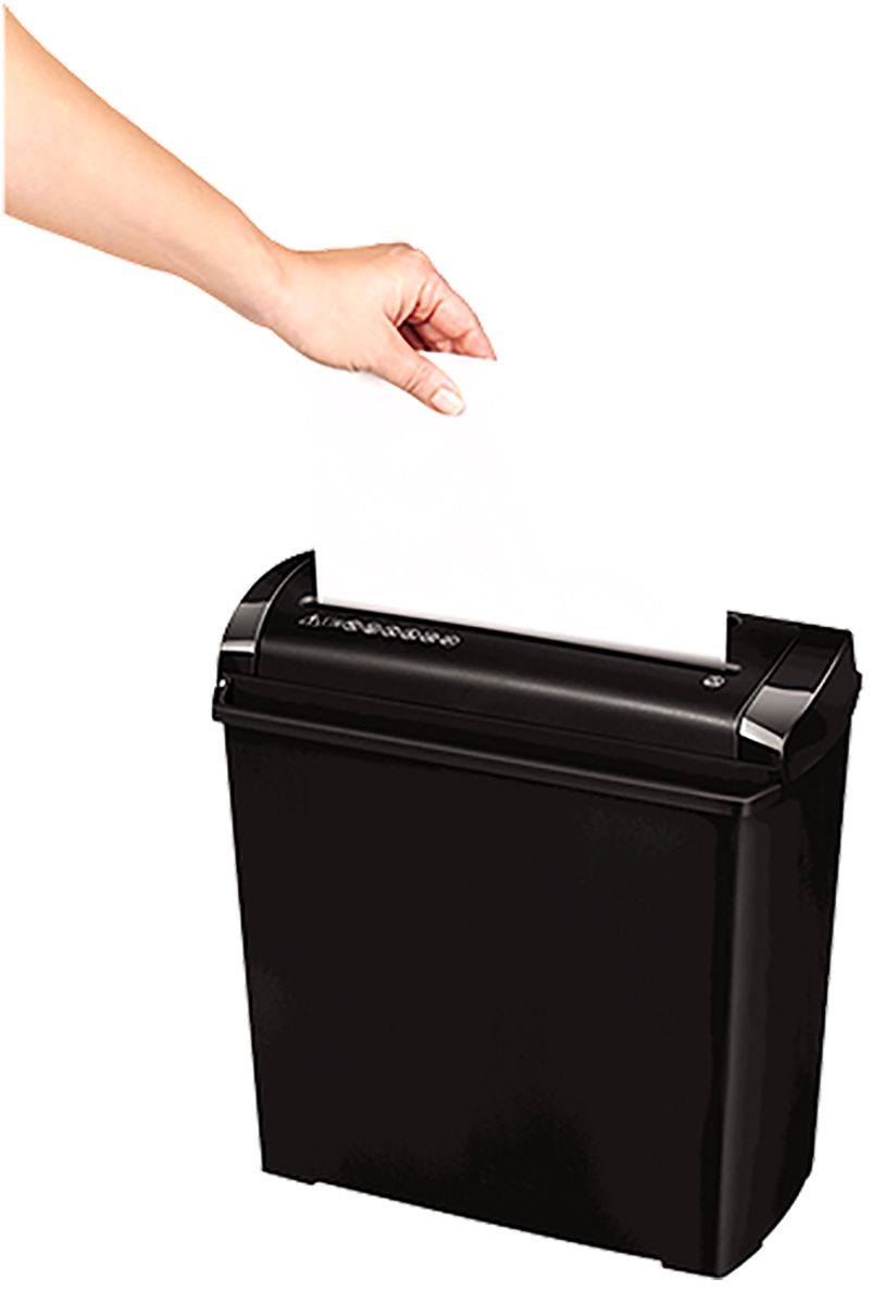 The Fellowes Powershred P-25s strip-cut paper shredder is a personal paper shredder designed for occasional home use and individual users. The P-25s is a security (DIN) level P-1 paper shredder and as a strip cut machine offers basic document security. It comes with an easy lift bin head for easy emptying of the 11 L shredder paper waste bin and a compact, space saving design. The Powershred P-25s machine has a run time of 3 min and can shred up to 5 sheets per pass into 7 mm strip-cut particles.