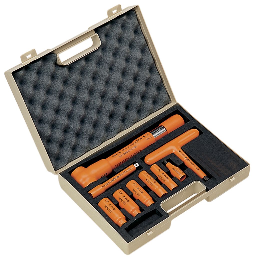 The MS100CC series 9 piece 3/8 in drive torque wrench and socket set from Sibille. The set is designed to help protect the user during live working, accidental contact or flashover when working on or next to energised systems.