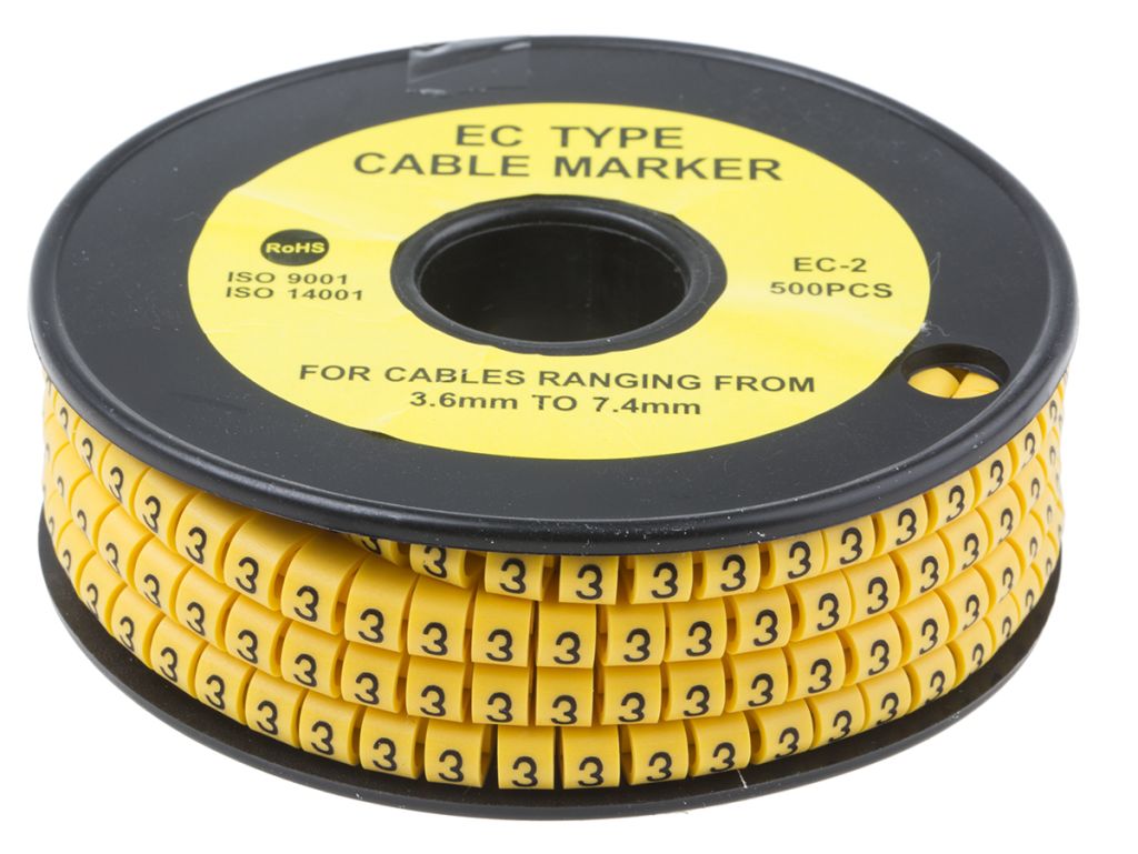 Product description RS PRO Slide On Cable Markers, Pre-printed "3", Black on Yellow, 3.6 → 7.4mm Dia. Range