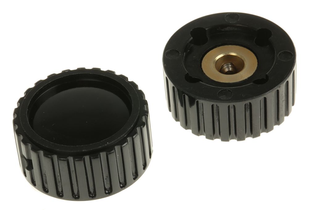 A selection of black high-quality compression mouldings with brass bushes suitable for inch diameter spindles. The knobs are recessed to accommodate control mounting nuts, except the Standard inch version, which also has a 6BA grub-screw. All other knobs have 4BA grub-screws.