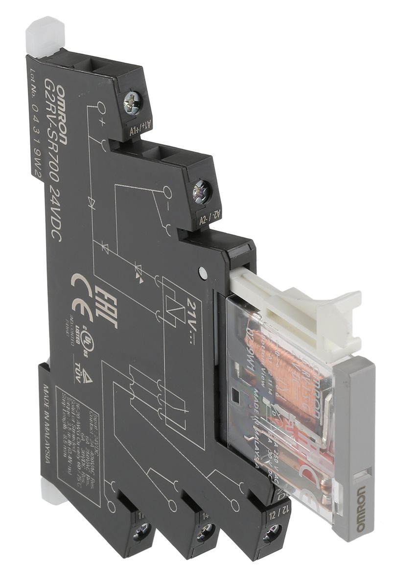 | Product description | Omron, 24V dc Coil Non-Latching Relay SPDT, 6A Switching Current DIN Rail Single Pole, G2RV-SR700 DC24 |