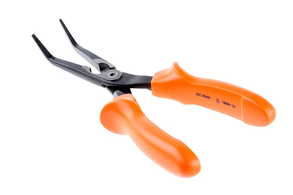 Snipe nose plier with insulated handles and tips angled at 60°