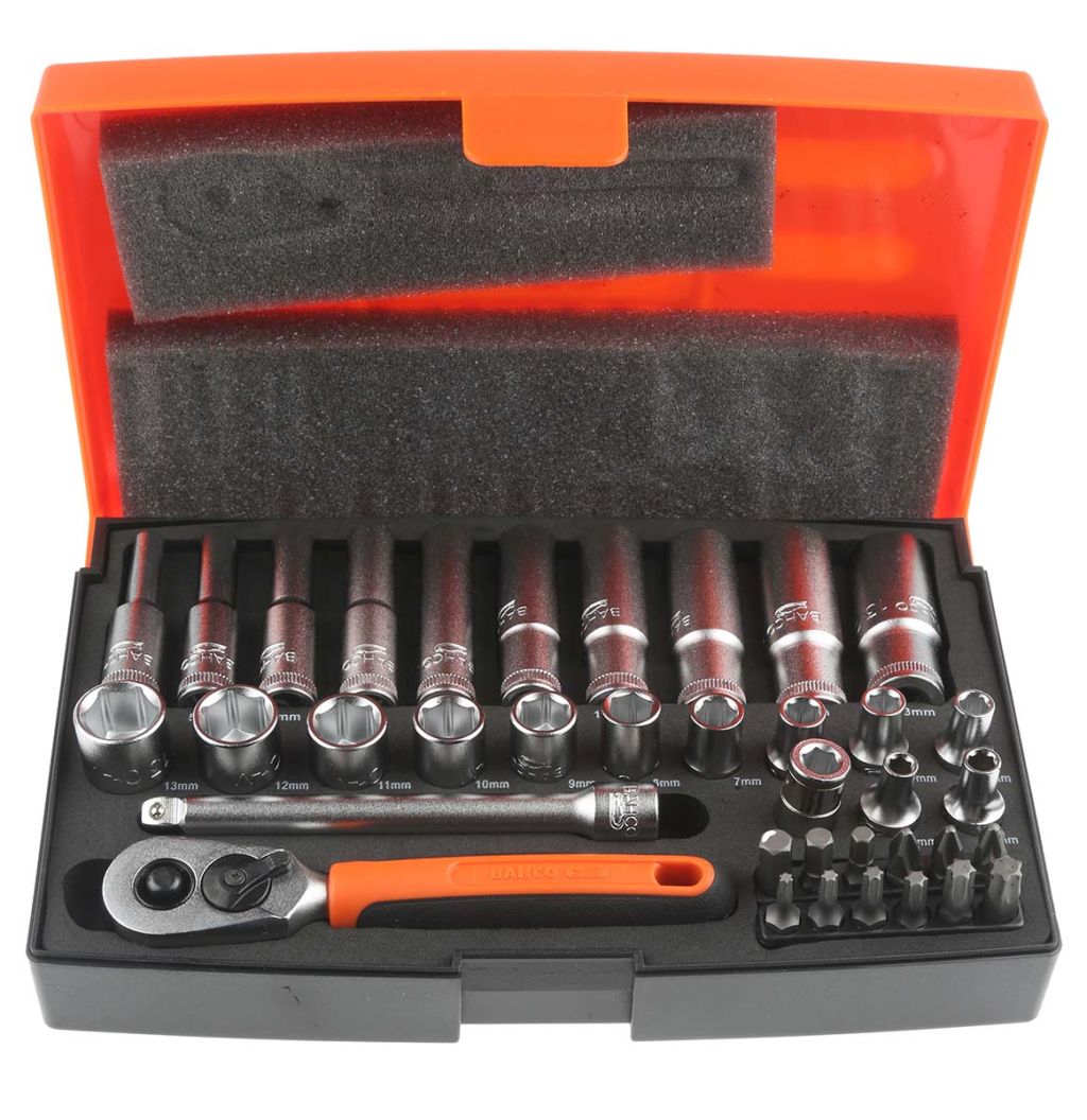 High quality SL25L socket set from Bahco. This 1/4in Hexagon drive deep socket set is supplied complete with 37 piece socket and bits. The socket set offers the most popular sizes sockets, a selection of bits and extensions plus a ratchet offering multiple positions. The high performance alloy steel sockets, ratchet and screwdriver with matt finish will give the user years of service. The soft grip ratchet in the set also has a quick release button making it easy to use and more productive for the user. Keeping your tools safe and protected, this kit comes in a high density polythene case.