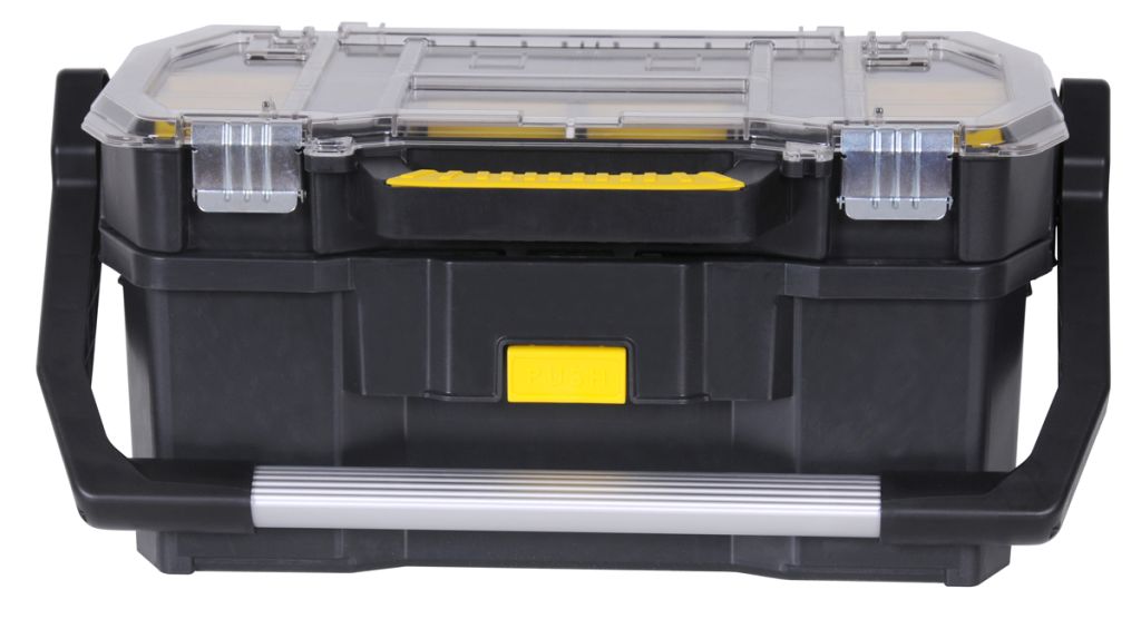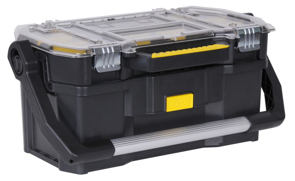 Stanley plastic tool tote and organiser is an excellent all round robust strong 19 inch plastic tool. Ensure safe and dry storage for your tools. Constructed of strong weatherproof plastic for extra strength, offers clear storage compartments on the top lid with compartment trays with movable dividers.