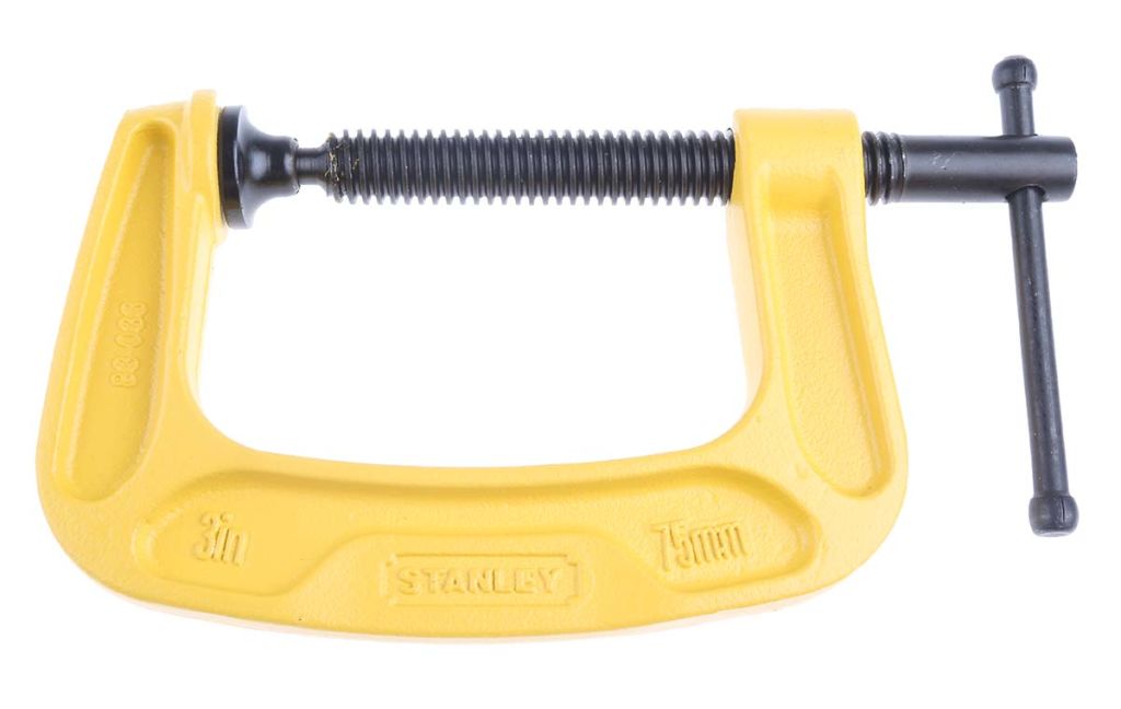 You should always use a G clamp which is a suitable size to hold your workpiece if not there is a chance of bending the frame and damaging the screw. The size can be measured by its jaw opening (how far the mouth of the jaws can open) and the depth. These G clamps from Stanely are available in 4 sizes to choose from: