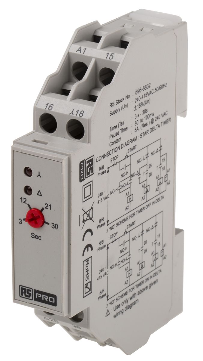 | Product description | RS PRO Timer Relay, Star Delta, 240 → 415V ac 3 → 120s, DIN Rail Mount |