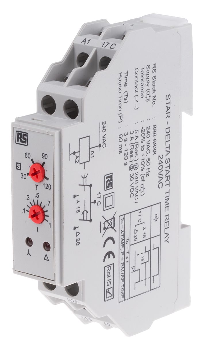 | Product description | RS PRO SPNO Timer Relay, Star Delta, 240V ac 3 → 120s, DIN Rail Mount |