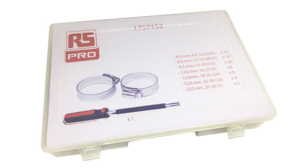 | Product description | RS PRO 70 Piece Mild Steel Worm Drive Hose Clip Kit, 9.5 → 12mm and 25 → 35mm Inside Diameter |