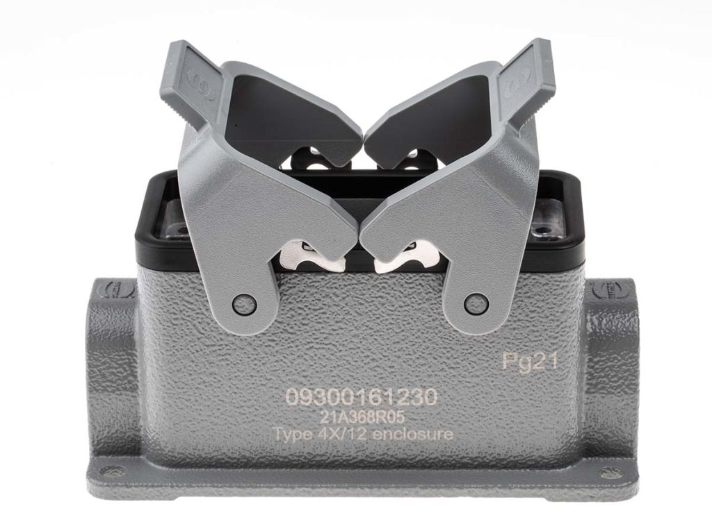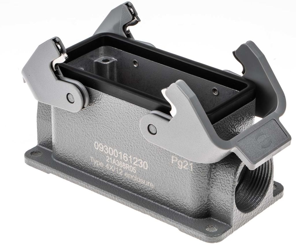 Harting Han 16B hoods and housings offered in a wide selection of formats, single lever, double lever, high and low construction, suitable for many applications. Utilises Han inserts, modules and frames.