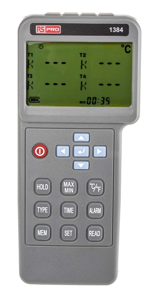 RS PRO 1384 is a great value digital 4-input Thermometer and Data Logger for working with any K, J, E, T, R, S, N, L, U, B and C-type thermocouple as the temperature sensor. Data loggers are portable electronic device that can measure and record the temperature of an environment. Temperature indication follows the international temperature scale of 1990 (ITS-90). The RS PRO 1384 features a 4 input function for T1 / T2 / T3 /T4 temperature display.