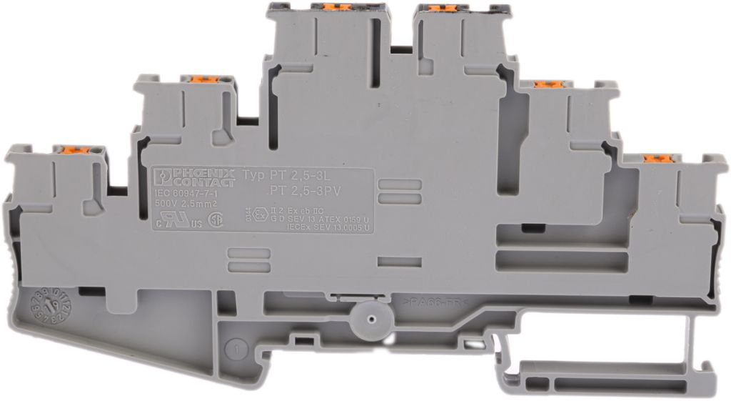 | Product description | Phoenix Contact Grey PT 2.5-3PV Multi Level Terminal Block, 26 → 12 AWG, 0.14 → 4mm², ATEX, 500 V |