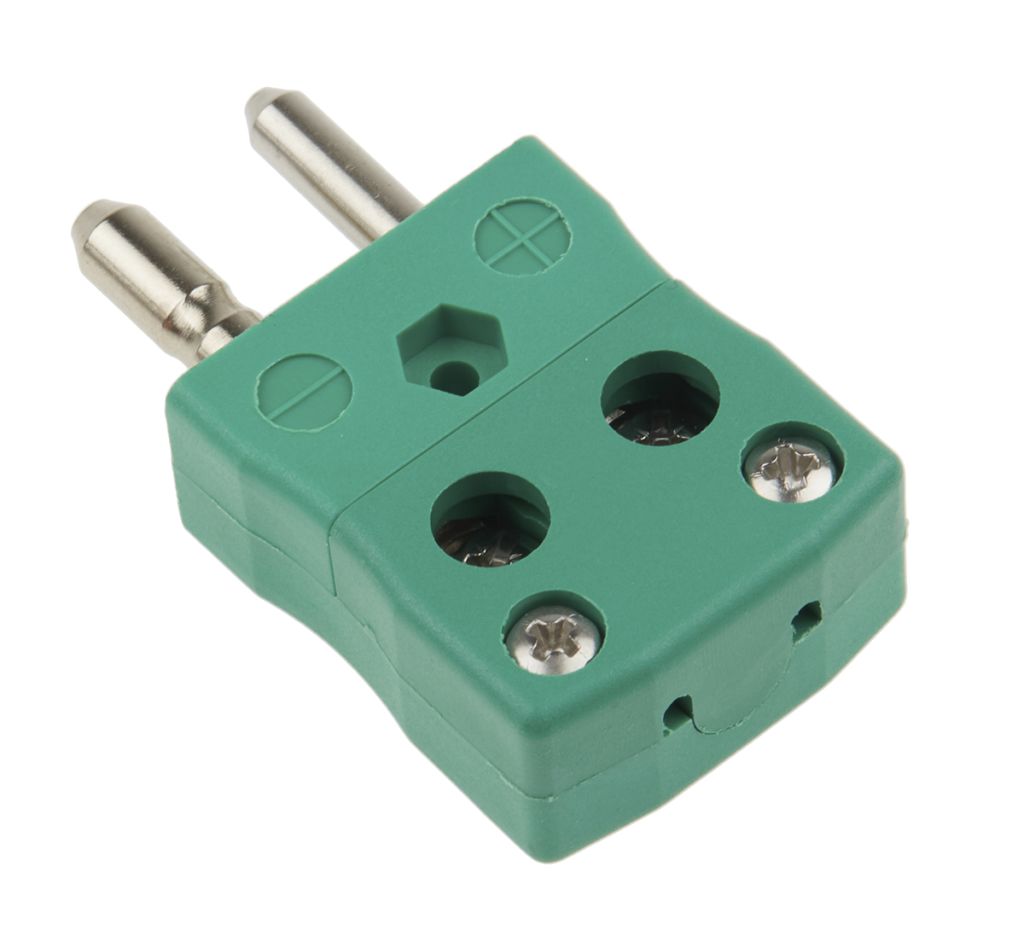 Thermocouple connectors are an accurate and convenient way of interconnecting your temperature sensing components. Using these connectors allows a chain to be formed from the measuring tip of your temperature sensor to the host computer or meter. It is important that all the components in the chain are made from the same thermocouple material to prevent any alteration or distortion of the original signal. To achieve this, thermocouple connectors have pins made from the same material as the thermocouple they are being used to connect or a compensating material. The connector housing has the thermocouple type clearly printed on it and is also colour coded to allow easy identification. The thermocouple wires are connected to the plug which can then be plugged into a mating standard thermocouple socket connector.
