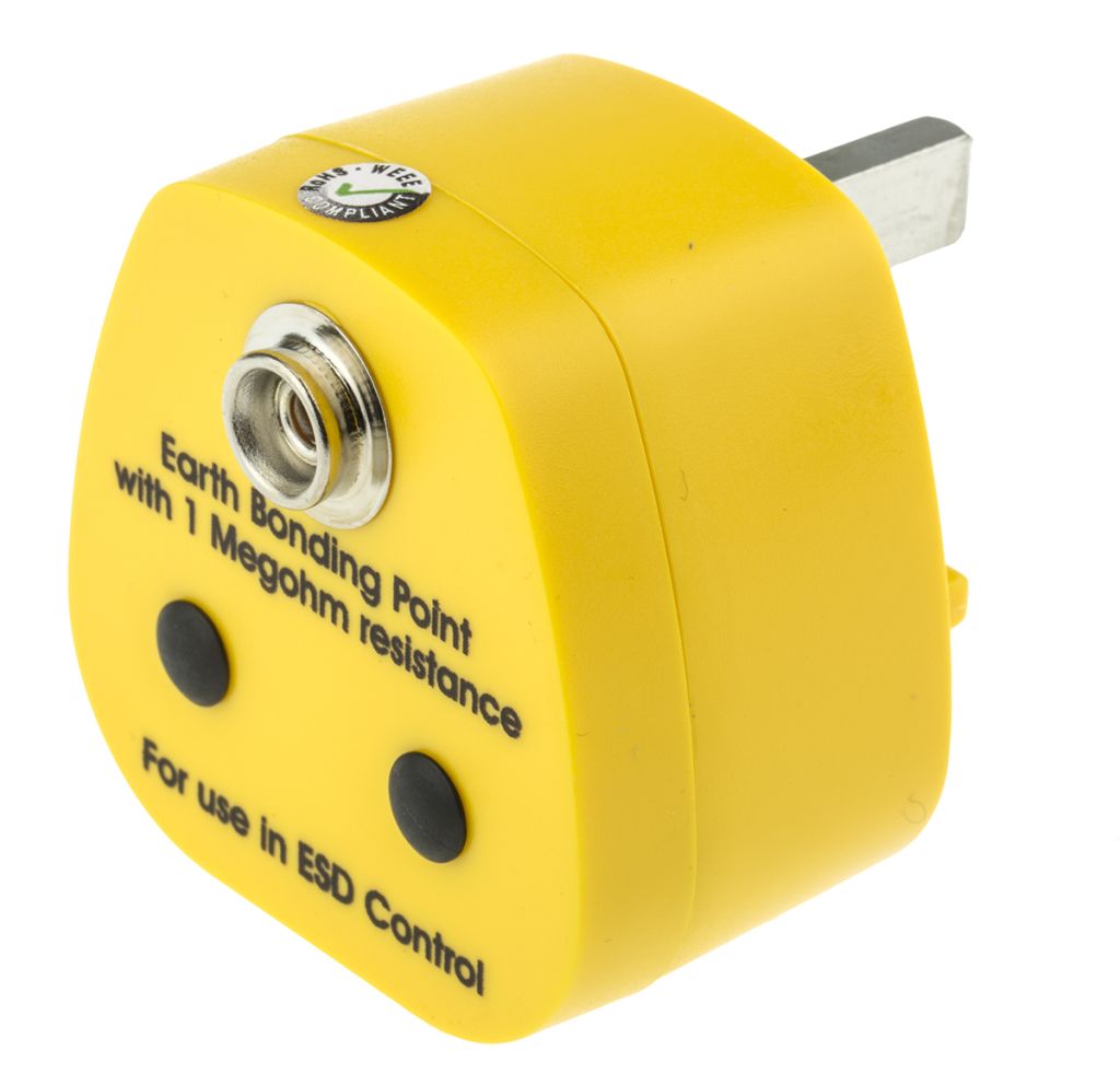 The Earth Bonding Point (EBP) plug is designed to provide a common ground point for grounding using protective earth in an ESD protected area (EPA). The plug fits into the mains supply socket, making a connection with the earth conductor only. In place of the live and neutral pins are moulded insulating plastic pins to allow positive location in the socket. Connectors on the front of the plug are available for connection via ground cords to the various elements of the EPA.