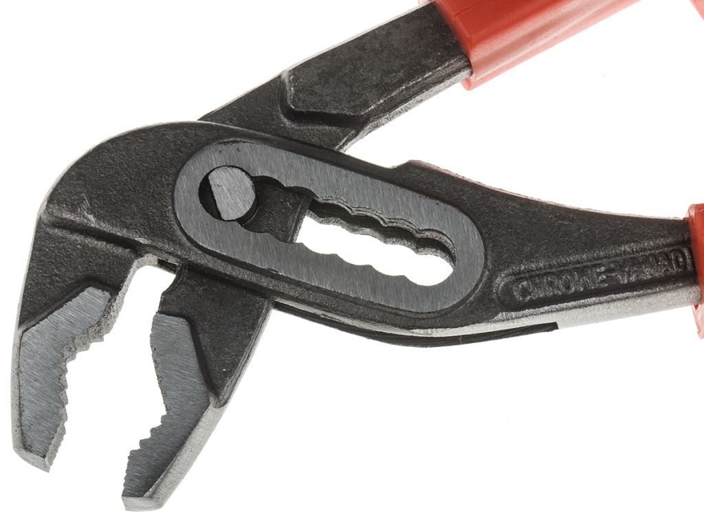 Our range of RS Pro branded VDE insulated adjustable water pump pliers with a box joint are made from Chrome Vanadium Steel and have an insulated grip. Although water pump pliers get their name from being used to tighten the packed glands in water pumps in cars and vans, they can be used for gripping nuts and bolts with large round or square diameters and other irregular shaped objects.