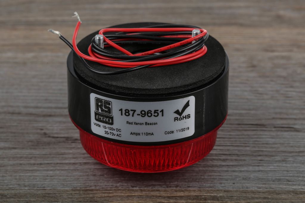 "RS PRO Red Xenon Beacon, 10 → 100 V dc, 20 → 72 V ac, Flashing, Stud Mount, Surface Mount" added to the basket