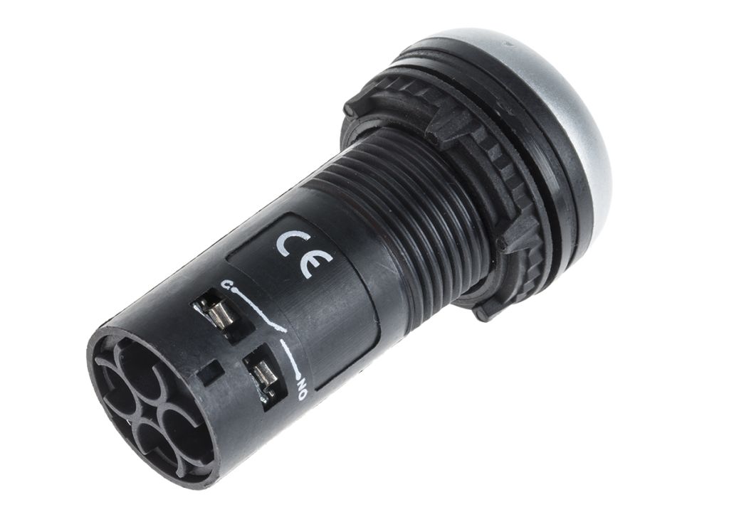 RS Pro range of panel mount spring return pushbuttons. These pushbuttons are supplied complete with built-in contact block.